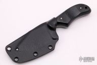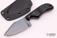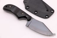 This Neck Bowie from Fred Perrin features a blued clip point blade with visible hamon, swedge and notched thumbrest, .144" blade stock and 1.215" blade depth, full tang construction. The handle is comprised of black linen micarta with nickel silver pins.  Includes a kydex sheath. New from maker.