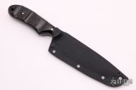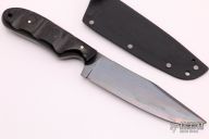 This Street Bowie from Fred Perrin features a blued clip point blade with visible hamon, swedge and notched thumbrest, .145" blade stock and 1.296" blade depth, full tang construction. The handle is comprised of black linen micarta with nickel silver pins. Lanyard hole with lanyard in pommel. Includes a kydex sheath. New from maker.