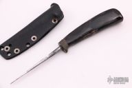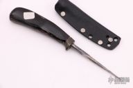 This pocket spike by Fred Perrin features a spike blade made from an old file and gun blued, .205" diameter file. Has a buffalo horn handle with black/white G-10 guard. Comes with a kydex sheath. New from maker.