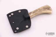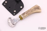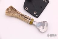 This knife from Fred Perrin features a hand forged blade with .148" blade stock and 1.202" blade depth, hidden tang construction. The handle has a yellow G-10 guard with stag grip. New from maker. Comes with kydex sheath.
