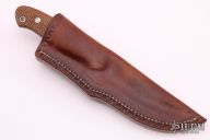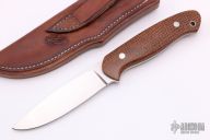 This Kentucky Hunter by HL Holbrook features a hand rub satin finished blade with notched thumbrest, .184" blade stock and 1.050" blade depth, full tapered tang construction. The handle has thunderstorm Kevlar scales with black G-10 liners, stainless Corby bolts, and a lanyard hole at the butt. Comes with a brown leather sheath with some hand tooling around the edges. Excellent condition.
