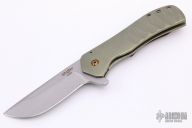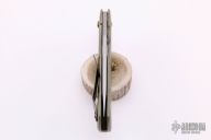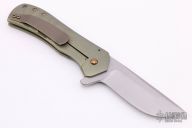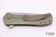 This Custom Recon flipper by Doc Shiffer features a tumbled blade with notched thumbrest and a flipper. The handle has an anodized and tumbled titanium frame and pocket clip is positioned for tip up carry. Rides on bearings, nice blade seating, detent and lockup. Flips well. Knife is in excellent condition. Comes with a zippered case.