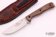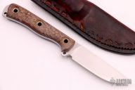 This Mean Street by Busse Combat features a satin finished blade with a full tang construction.  The handle features micarta scales over blue liners.Includes a brown leather sheath.  Light scratches are visible on the blade otherwise the knife is in good condition.