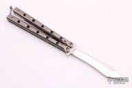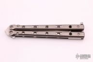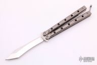 This Model 67 Balisong by Benchmade features a tumble finished tanto recurve blade and Flytanium tumbled titanium handles with T-latch. Comes with original stainless steel handles. Comes with original box, sheath and papers. Excellent condition.