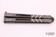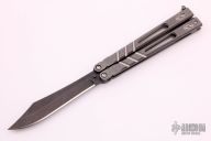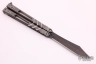 This Alpha Beast Balisong 3.0 from Blade Runner Systems (BRS) features an acid washed clip point blade. The handle is comprised of millled and tumbled titanium with T latch on pommel. Excellent condition. Comes with original box and papers.