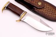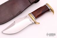 This Elmer Keith by Harvey Draper features a mirror polished blade with a sharpened top edge and notched thumbrest, .364" blade stock and 1.911" blade depth, hidden tang construction. The handle has a brass guard and butt, cocobolo grip with black/aluminum spacers. Comes with a hand tooled brown leather sheath. Has a few light scratches, otherwise excellent condition.