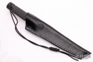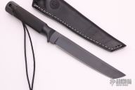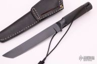 This rare South African 7" Tanto features a black coated, tanto shaped blade. The blade is stamped #4. The knife also features a knurled handle, screw off butt cap, and a black leather sheath. Below is the response received from Mrs. Anne Reeve when more information was requested regarding this piece: