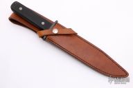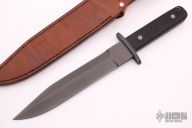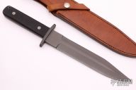 This Combat Fighter by Pat Crawford features a bead blast finished blade with a sharpened top edge, .245" blade stock and 1.493" blade depth, full tang construction. The handle has a bead blasted nickel silver guard and black linen micarta scales. Comes with a brown leather sheath. Has a few light scratches/scuffs, otherwise excellent condition.