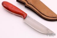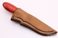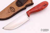 This fixed blade from Alex Collins features a polished drop point blade with notched thumbrest, .085" blade stock and 1.361" blade depth, full tang construction. The handle has red wood scales with brass pins over white liners. Comes with a brown leather sheath made by Russ Green. Signed and dated on the tang.