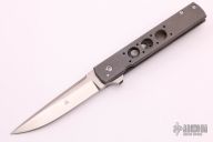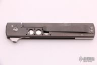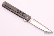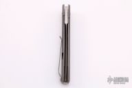 This Buzz by Jason Clark features a satin finished blade with swedge and checkered flipper. The handle has a tumble finished titanium frame with  tip up titanium clip and a stainless steel backspacer. Rides on IKBS. Comes with leather zippered case. Nice detent, lockup and blade seating. Excellent condition. Comes with COA dated Nov, 4 2017.