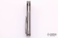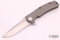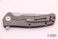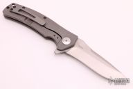 This Horizon B features a stonewashed recurve blade with false top edge, notched thumbrest and flipper. The handle has a milled titanium frame with matching tip up clip. Nice detent, lockup and blade seating. Comes with nylon zippered case and original box. Excellent condition.