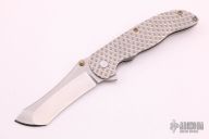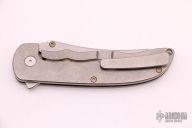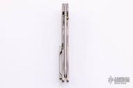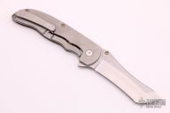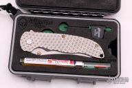 This Norseman (#1570) by John Grimsmo features a tumble finished blade with a single anodized titanium thumb stud, notched thumb ramp and flipper. Tumble finished titanium frame with a textured front scale and anodized titanium screws. Very smooth action that requires no wrist movement. Nice detent, lockup and blade seating. Rides on ceramic bearings. Knife is in excellent condition, shows no signs of use or carry. Comes with original packaging, custom hard case, Nano-Oil, tool, and COA dated Oct 17, 2018.
