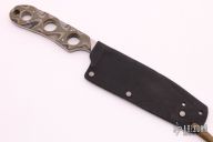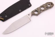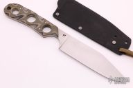 This Fred Perrin Bowie has a satin finished stainless steel clip point blade with full tang and notched thumbrest. Blade width is .114", depth is 1.085". Handle is green/black/brown G10. Comes with Kydex sheath and original packaging. Has some light sheath marks, otherwise excellent condition.