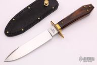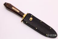 This is a discontinued Bill Bagwell designed Drifter Bowie, made by Ontario Knife. Has a satin spear point blade, .300" blade stock and 1.220" blade depth, hidden tang construction. Wooden coffin handle with nameplate and brass pins. Black leather sheath with brass rivets and stud. Excellent condition. Comes with original box.