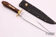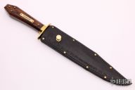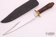 This is a discontinued Bill Bagwell designed Gambler Bowie, made by Ontario Knife Company. Features a satin finished clip point blade with sharpened top edge, .310" blade stock and 1.264" blade depth, hidden tang construction. The handle has a brass guard/collar/studs, and a dymondwood grip. Includes all original box and black leather sheath. Excellent condition.