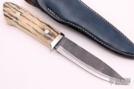 This sheath knife by Shosui Takeda features a Stainless Clad Aogami Super Steel (NAS) blade, .138" blade stock and 1.236" blade depth, hidden tang construction. The handle has nickel silver guard, and a 2-piece mammoth ivory grip with nickel silver pins. Comes with a blue leather sheath. Handle by Moriya. New from maker.