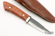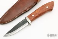 This sheath knife by Shosui Takeda features a Stainless Clad Aogami Super Steel (NAS) blade, .132" blade stock and .989" blade depth, hidden tang construction. The handle has nickel silver guard, and a Rosewood grip with nickel silver pins. Comes with a brown leather sheath. Handle by Moriya. New from maker.