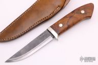 This sheath knife by Shosui Takeda features a Stainless Clad Aogami Super Steel (NAS) blade, .151" blade stock and 1.072" blade depth, hidden tang construction. The handle has nickel silver guard, and an Ironwood grip with nickel silver pins. Comes with a brown leather sheath. Handle by Moriya. New from maker.
