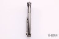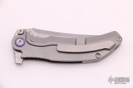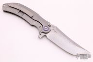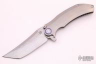The Artisan Cutlery 1838GD features a Damascus upswept tanto blade with notched thumbrest and flipper.  The features a titanium frame with a matching tip up pocket clip and backspacer.   Comes with a Collector’s Tin with nylon storage pouch and VIP specification card. Nice Detent, lock up and blade seating.  Excellent Condition.