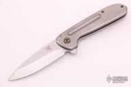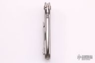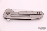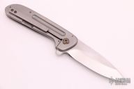 The Gath frame lock, by Alan Kritzman, features a satin finished drop point blade with a notched thumbrest and flipper.  The frame, back spacer and tip up pocket clip are composed of titanium. Includes padded zippered case. Light scuffs are visible on the blade otherwise the knife is in excellent condition.