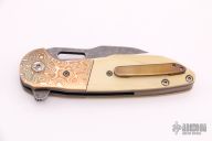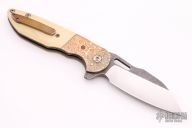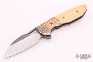 This Raptor by Nova Blades features a two-tone blade with satin finished grinds and tumbled flats with a thumb whole and notched flipper. The handle features Mokume bolster and Westinghouse micarta scales and an anodized titanium tip up pocket clip. Light scratches are visible on the handle and pocket clip otherwise the knife is in excellent condition.