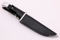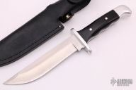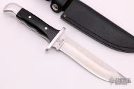 This Frontiersman by Buck features a satin blade and black linen micarta scales. Aluminum rear bolsters and guard. Full tang construction with .182" thickness and depth of 1.339". Comes with black leather sheath. Has some scratches, has been used, otherwise good condition.