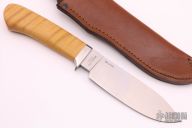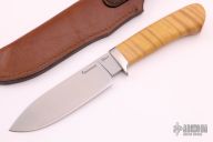 This John Fitch Large Drop Point Hunter by Browning Knives features some really nice looking stabilized and contoured light curly maple wood handle with stainless steel guard. Satin finished high carbon steel drop point hunting blade that is laser etched BROWNING FITCH - 104 OF 500 MODEL 575 U.S.A. This knife is serial numbered #104 of only 500 made. “Big” John Fitch brings a natural talent to the knife making industry. He teaches knife making at “Hammer-ins” for the ABS across the country, and finished second at the 2003 annual ABS World Championship Cutting Competition and third in 2004. John takes great pride in the continual learning process of his craft and in his ability to make functional knives. Comes with a brown leather sheath. Excellent condition.