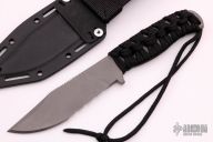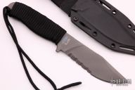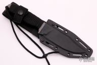 "The MPS was designed as a flat and compact knife that was purposely designed to fit in the sheath on the United States Air Force, Navy, Marine Corps, and Army pilot survival vest. The blade is a smaller version of the MPK and the same versatile blade belly makes it a superior utility and survival model. The skeletonized handle allows this knife to fulfill requirements where ultimate lightweight and thin profiles are demanded. Regardless of whether you pilot an F/A-18 strike fighter from an aircraft carrier, a C130 aircraft for AFSOC or an Apache helicopter, this knife is always out of your way but always ready for immediate and intense use. Military and law enforcement personnel like the MPS because of its durability, lightweight and overall tough characteristics. It works equally well in desert or arctic conditions due to the specialized titanium construction ensuring that it will not break in subzero weather as steel does. Military personnel choose it because it makes an excellent all purpose work knife. They have told us that the MPS is the perfect utility knife and is widely used in SERE and many other applications." This MPS by Mission Knives has a bead blasted titanium blade with partially serrated edge and false top edge, .254" blade stock and 1.370" blade depth, full tang construction. Comes with black kydex sheath with nylon belt loop. Excellent condition.