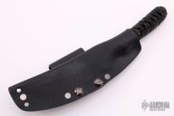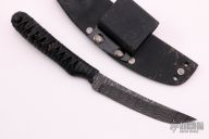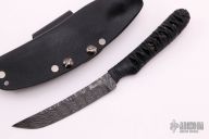 This custom fixed blade from Barry Dawson features an upswept Damascus blade with a hidden tang construction. The handle features a black paracord Japanese style wrap over stingray and menuki. Includes a kydex sheath. Excellent Condition.