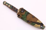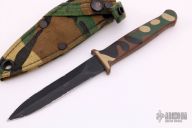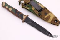 This Guardian I by Gerber features a double edged black coated blade, .176" blade stock and .817" blade depth, hidden tang construction. The handle is camo coated aluminum. Comes with a nylon camo sheath. Has some wear on the blade finish, has some scuffs, otherwise good condition. #B7518S.