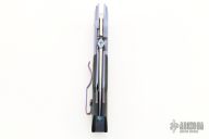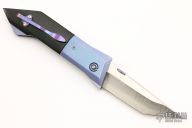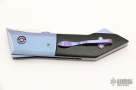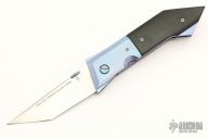 This knife is called "Stealth Project" and is one of a kind. The original owner who had this knife built says "Rather than an exact replica or "Po'Boy", this was to a build in the spirit of the Emerson Stealth." It started its life as a Roadhouse. The regrind was done by Tom Krein. Ferrrk did the anodized titanium dovetailed bolsters, liners and backspacer, as well as wave removal and black G-10 scales. He replaced them with black paper micarta scales. Pete tapped it for a titanium pocket clip, did blue anodization, and crafted a thumb disc in the spirit of the thumbdisc that was on the original Stealth. Nathawut crafted the titanium pivot. ITSLASER handled the engraving. The number "12" on the blade is not the serial number, it is the 12th knife in the original owner's collection. Excellent condition.
