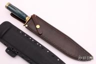 This bowie by Ryan D Wielkie features a mirror polished blade with sharpened top edge, .243" blade stock and 1.668" blade depth, hidden tang construction. The handle has a brass guard and butt with green dymondwood grip and black spacers. Comes with a hand tooled brown leather sheath and a C4 Industries kydex sheath. Excellent condition.