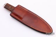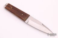 This Boot Knife by Kelgin Knives features a satin finished blade with false top edge and fileworked thumbrest, .096" blade stock and .981" blade depth, full tang construction. The handle has cocobolo scales and brass pins. Comes with a brown leather sheath. Excellent condition.