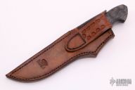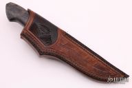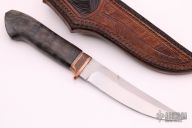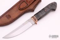 This Hunter by Chuck Schuette features a hand rub satin finished clip point blade with false top edge, notched thumbrest and hammer marked flats, .141" blade stock and 1.093" blade depth, hidden tang construction. The handle has a a textured copper guard that has a coin edged nickel silver spacer, stabilized curly oak grip with a textured copper single pin. Comes with a beautiful hand tooled brown/black leather sheath. New from maker.