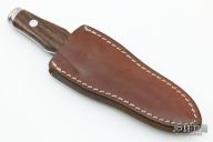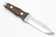 This is a very attractive boot knife from AG Russell. This is the older model made in Solingen, Germany. Blade is .162" thick and 1.083" deep at the ricasso and double-edged. Scales are wood. Integral construction with aluminum pins. Comes with brown leather sheath with clip. Has some scratches and has been resharpened, otherwise good condition.