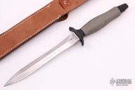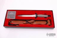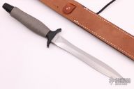 This 20th Anniversary Mark II #XX2459 has a satin finished stainless steel double-edged blade with hidden tang. Blade stock is .238", depth is .893". Handle is Grey "Cat's Tongue" textured aluminum with black double guard and black butt cap - with lanyard hole. Comes with original black leather sheath, box, papers. This model has a 5 degree canter on the blade so it rides closer to the body during carry. Excellent condition.