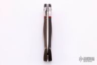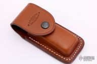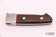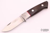 This Loveless Design linerlock folder by Lone Wolf Knives features a satin blade, stainless bolsters with red spacer, and brown canvas micarta scales, stainless steel liners, lanyard hole at the butt. Very nice palm swell and the backspacer is tapered giving it the look of a premium fixed blade. Includes leather sheath and original box. Excellent condition.