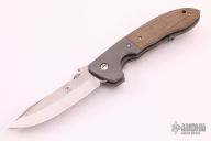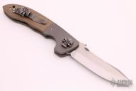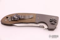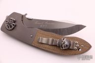 This custom Super CQC-8 by Ernie Emerson features a hand-ground satin finish blade, dovetailed bead blast titanium bolsters, and green canvas micarta scales, bead blasted titanium liners, black G-10 backspacer, tip up stainless steel clip with Emerson Skull and Emerson Skull on pivot. Wave feature. Includes original box and papers. Excellent condition.
