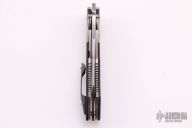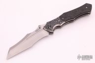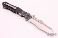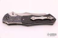 This Interstellar by Shane Sibert features a satin finished blade with notched thumbrest, fullers and dual thumbstuds. The handle has textured titanium bolsters, marble carbon fiber scales, titanium liners, floating marble carbon fiber backspacer, tip up titanium clip with a titanium roller. Nice detent, lockup and blade seating. Comes with a hard case. Excellent condition.