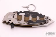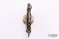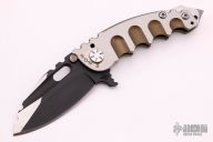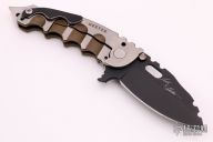 This Man of War GEN2 flipper by TS Heeter features a black multi-ground blade with notched thumbrest, fullers, thumbhole and flipper. The handle has a anodized titanium frame with tip up reversible titanium clip, steel backspacer. Has a pin with split ring that can be used to lock the blade open, or it can be removed to reveal a lanyard hole. Nice detent, lockup and blade seating. Excellent condition. Includes COA and zippered case. Dated 1-1-19. This knife was Todd's personal carry.