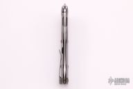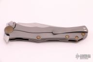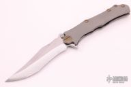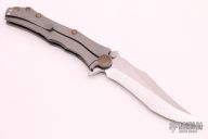 This Pilgrim by Alexey Konygin, it features a Damasteel blade with flipper. The handle has a bead blasted titanium frame with anodized hardware, floating titanium backspacer and a tip up clip. Comes with a zippered case. Dated 01/2019 inside backspacer. Excellent condition.