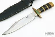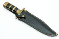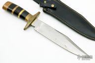 This knife by John Nelson Cooper features a satin finished blade with sharpened top edge, .238" blade stock and 1.725" blade depth, hidden tang construction. The handle has a brass guard and butt, black canvas micarta grip with brass spacers. Comes with a black leather sheath, but the snap is broken. Has some scratches and light oxidation, otherwise good condition. Made in 1964.
