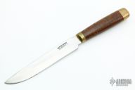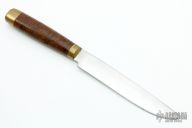 This knife by John Nelson Cooper features a satin finished blade with .095" blade stock and .996" blade depth, hidden tang construction. The handle has a brass guard and butt, grown canvas micarta grip. Has some scratches and light oxidation, otherwise good condition. Made in 1964.