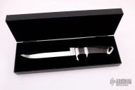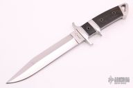 This is a Kressler design integral subhilt fighter by Boker Plus features a mirror polished blade with false top edge, .248" blade stock 1.266" blade depth, integral construction. The handle has integral guard, sub-hilt and butt with lanyard hole and black micarta inlays. Comes with original black leather sheath, box and papers. #0239 on blade spine. Excellent condition.