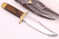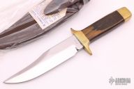 This Bowie from Smith & Wesson features a polished clip point blade with false top edge, .246" blade stock and 1.350" blade depth, hidden tang construction. The handle is comprised of a brass guard and pommel with hood handle. Includes original box and leather sheath. Excellent condition. #3398