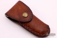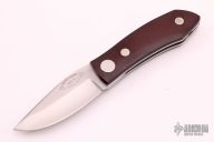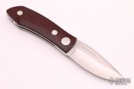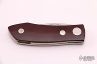 This Barry Wood swing lock folder features a satin finish blade and satin finish stainless steel frame with maroon linen micarta scales. This is a very unique scissor opening folder, which when the blade is fully open and locked in place is almost a fixed blade knife. The handle is nicely contoured for a comfortable grip. Opening is accomplished by lighting pressing down and outward at the rear indentation on the spine, which releases the locking pin and allows one side of the handle and the blade to rotate down then forward until the blade locks in the forward position. The one side of the handle continues to rotate back until it locks in place. Closing requires the same slight thumb pressure at the indentation to release the locking pin, then the one side of the handle is rotated back and around, catching the blade and aligning both with the other side of the handle in a locked closed position. Has some light scratches, otherwise good condition for its age. Comes with a brown leather sheath.