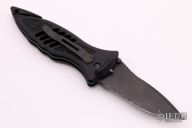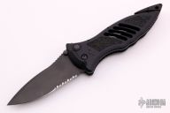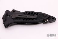 This CQD Mark 1 Auto from Masters of Defense has a spear point black partially serrated blade with dual thumb studs. Handle is black aluminum with non-slip inserts, reversible black tip down clip, seat belt cutter, lanyard hole and glass breaker. Includes a nylon sheath.  Scuffs and scratches are visible on the blade otherwise the knife is in good Condition.