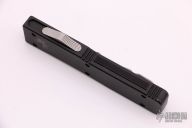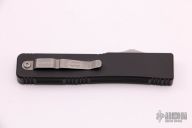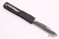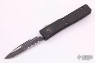 This Ultratech OTF automatic from Microtech features a drop point blade with partial serrations.  The handle has a black anodized aluminum handle with stainless steel thumb slide and tip down clip. Dated 07/2003 with a serial number of 3151. Light scuffs are visible on the blade and handle otherwise the knife is in Excellent condition.
