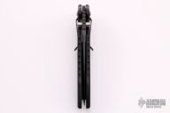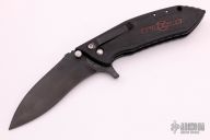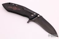 This knife features a black DLC coated zero ground blade with false top edge, notched thumbrest, and dual thumbstuds and flipper. The handle has a black aluminum frame with black G-10 inserts, 2 black titanium clips, one on the right side and one on the left. #0245 on handle spine. Comes with original box/tube and papers. There are light scuffs/scratches on the handle ad blade otherwise the knife is in Excellent Condition.