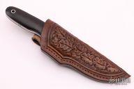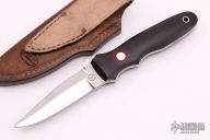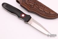 This KM-6 Arkansas Toothpick by Dozier knives features a satin finished D2 blade with false top edge, .164" blade stock and .874" blade depth, full tang construction. The handle has black linen micarta scales with a red linen micarta insert, aluminum pins and lanyard hole. Comes with a hand tooled brown leather sheath with belt loop by Sonja Lee. Has been resharpened and hand rub satin finished, otherwise good condition.
